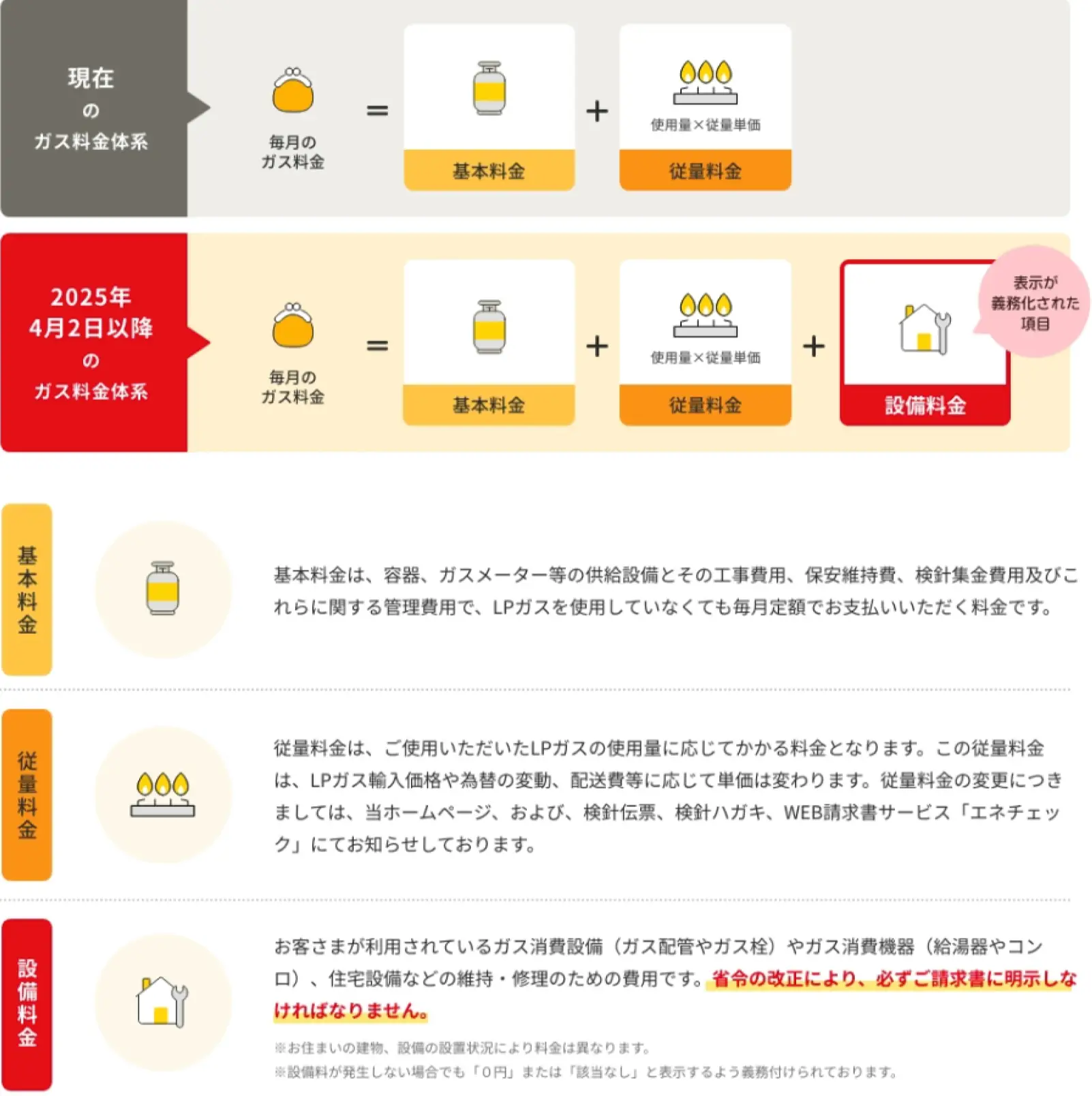 これにより、2025年4月2日からお客さまに対してLPガス料金をご請求する際は、基本料金、従量料金、設備料金からなる三部料金制に変更することが義務化されました。